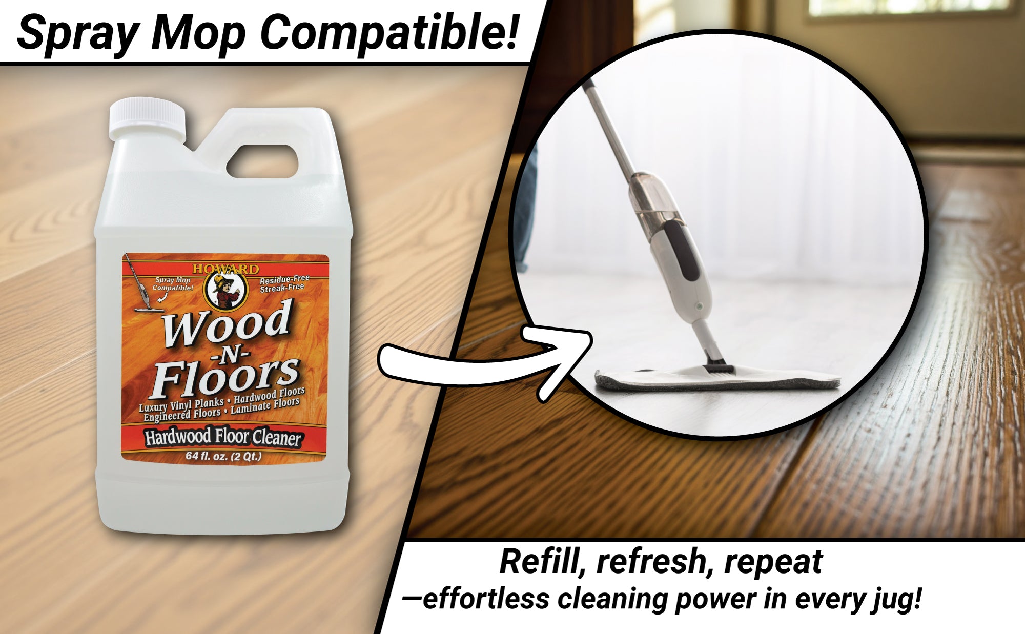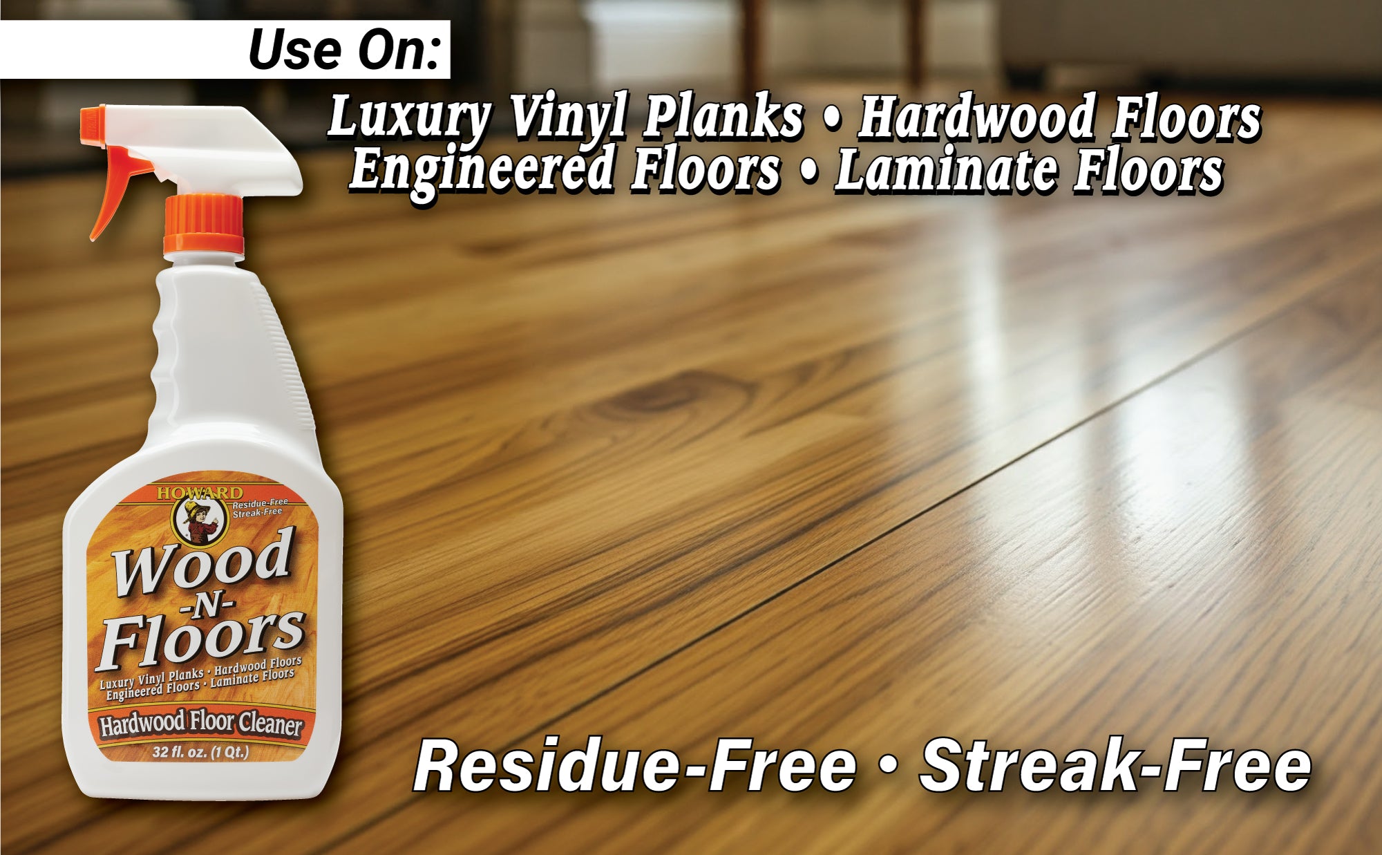 Wood-N-Floors cleans hardwood floors, luxury vinyl planks (LVP), laminate, and engineered floors. It quickly removes dirt and grime from hardwood floors without leaving any sticky residue or streaks. This ready-to-use mixture of water-based, plant-derived surfactants will gently clean your hardwood floor. Howard Wood-N-Floors cleans to reveal the natural shine on hardwood flooring, cabinets, furniture, and more!